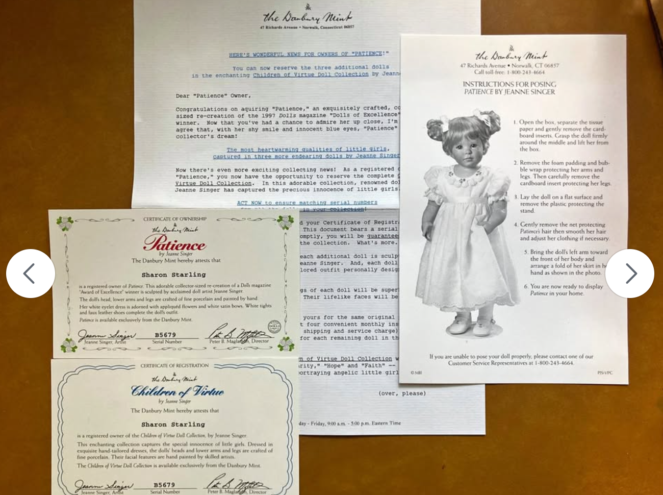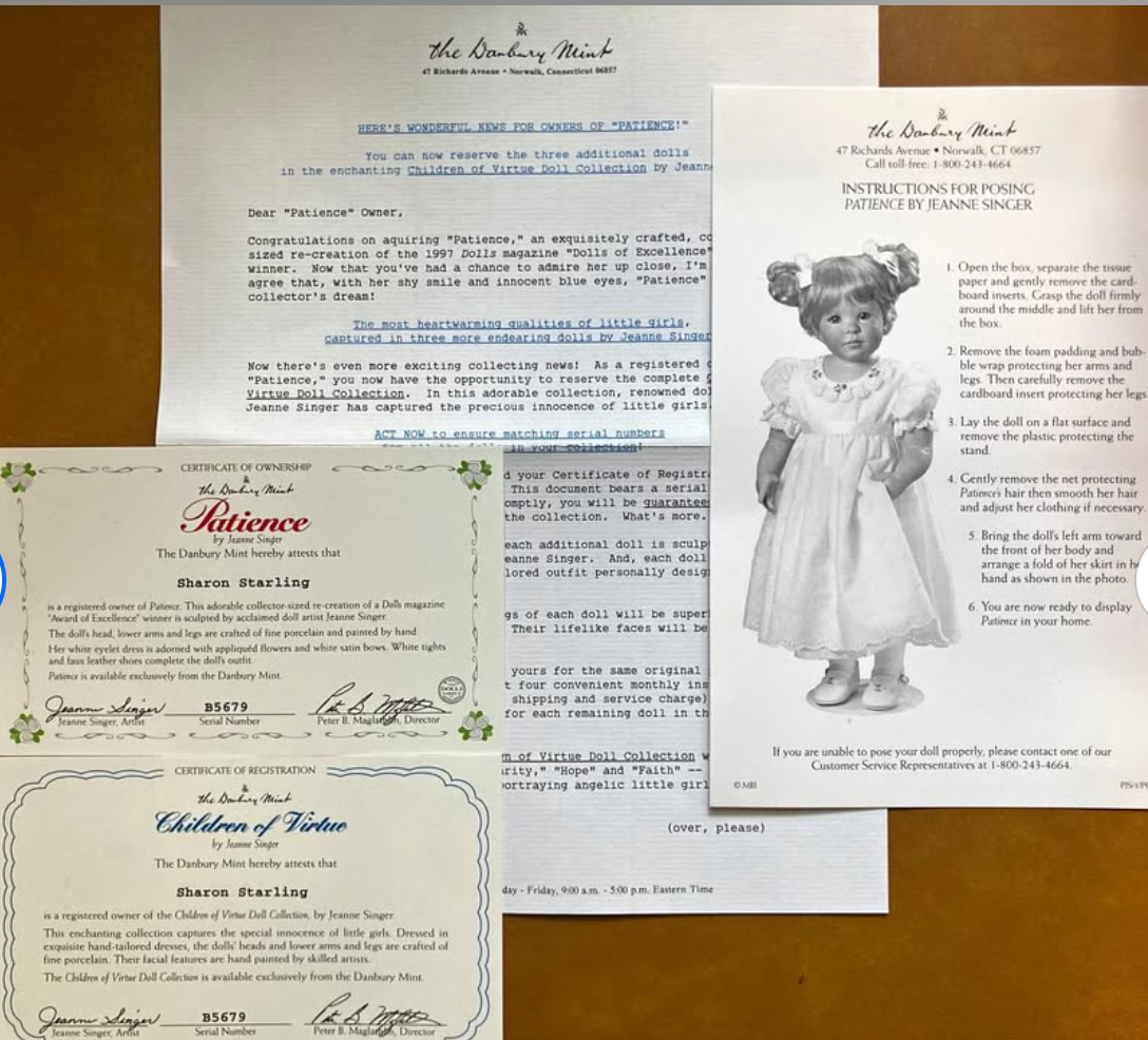 Comes with Certificate of Ownership and all original paperwork! Part of the Children of Virtue Doll Collection made by The Danbury Mint in 1997. This doll is 18 inches tall. She is made of porcelain has blue eyes and blond hair styled in pigtails. She is wearing a white dress adorned with appliqued flowers and white satin bows, and she has on white tights and faux leather shoes. This doll is very lifelike and realistic!